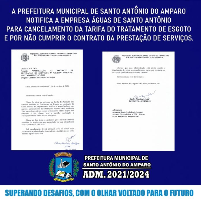 A PREFEITURA MUNICIPAL DE SANTO ANTÔNIO DO AMPARO NOTIFICA A EMPRESA ÁGUAS DE SANTO ANTÔNIO PARA CANCELAMENTO DA TARIFA DO TRATAMENTO DE ESGOTO E POR NÃO CUMPRIR O CONTRATO DA PRESTAÇÃO DE SERVIÇOS.